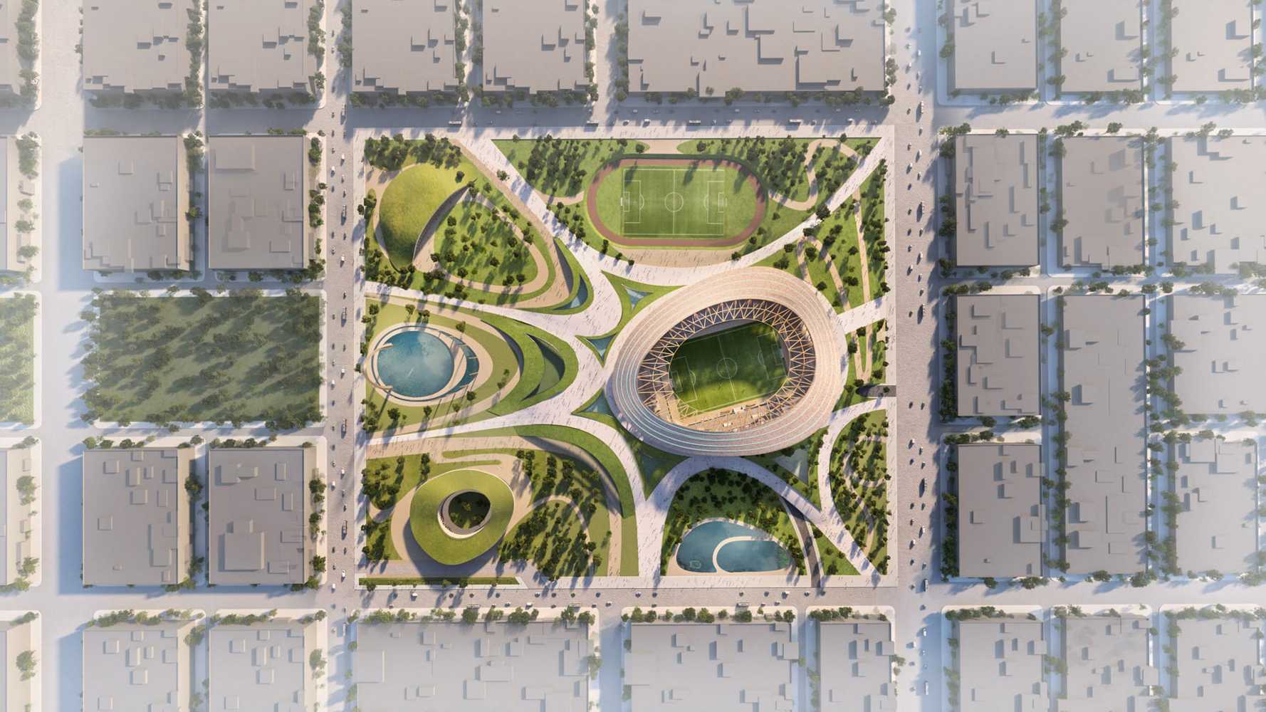 Dla stadionu wytyczono szeroką, prostokątną działkę o powierzchni 19,12 ha, położoną w zachodniej części odbudowywanego Ağdam. Stadion będzie głównym, dominującym elementem założenia, a obok niego powstanie również boisko treningowe z bieżnią.