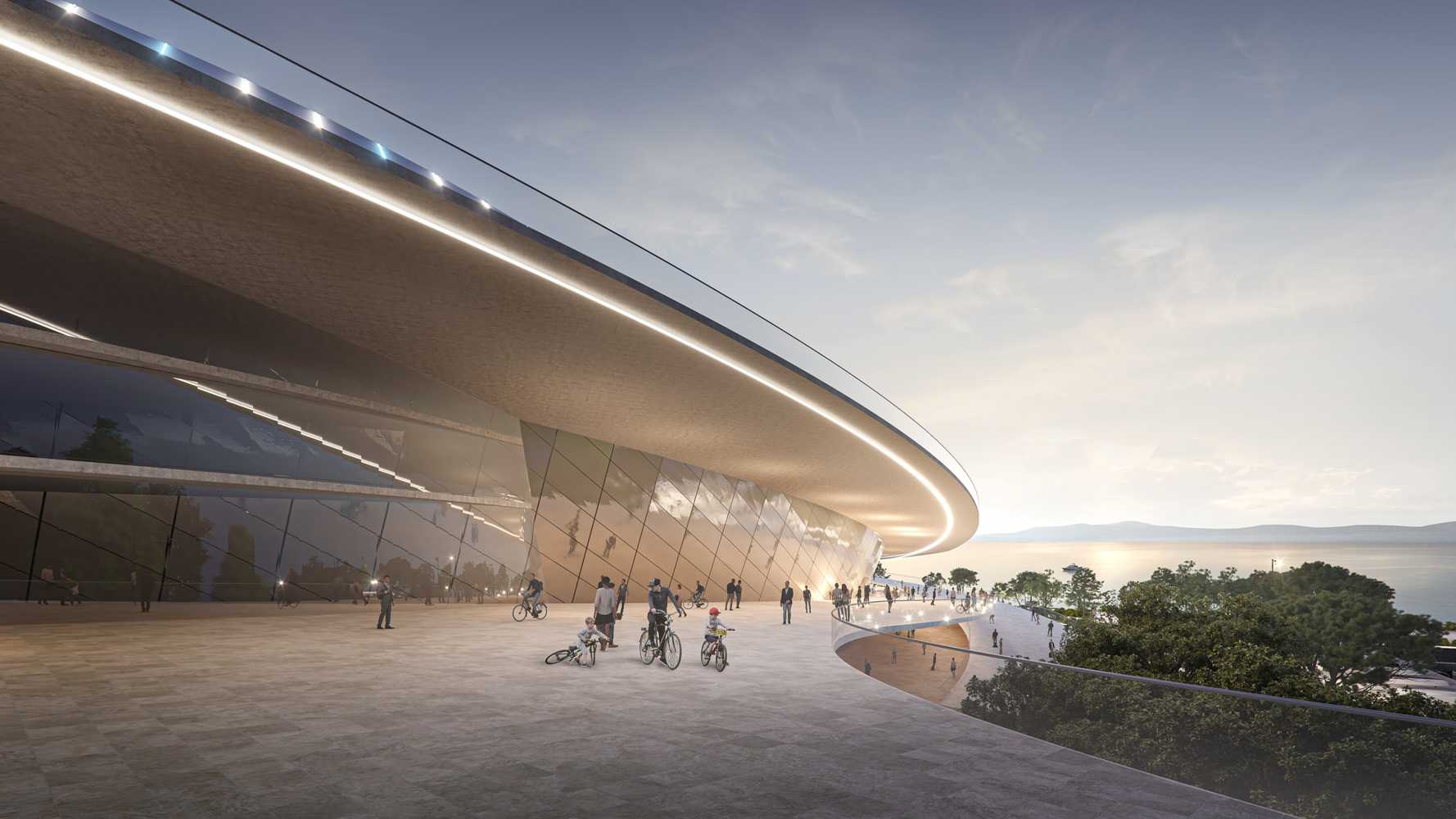 Charakterystycznym elementem areny ma być rozległy dach, opadający w kierunku południowym i wsparty wysokim pylonem w kształcie odwróconej litery V. Po bokach zaplanowano szerokie promenady, które – podobnie jak cały budynek – stopniowo obniżają się, prowadząc od biegnącej na wysokim klifie ulicy Istarskiej aż do wybrzeża.