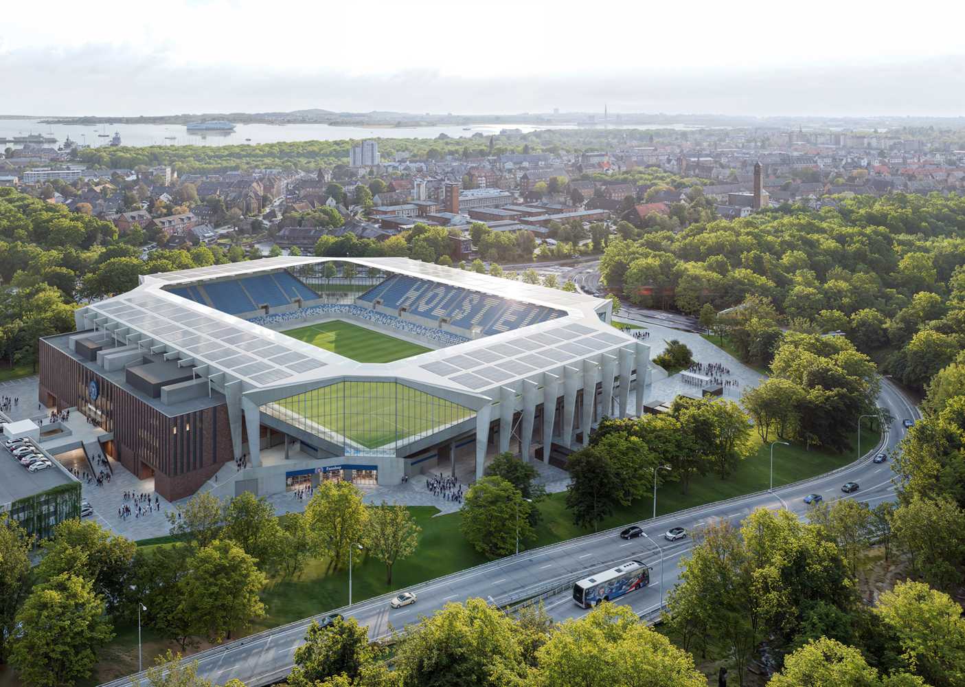 Żebrowa konstrukcja dachu ma nawiązywać do budowy statków, akcentując związek stadionu z tożsamością miasta.