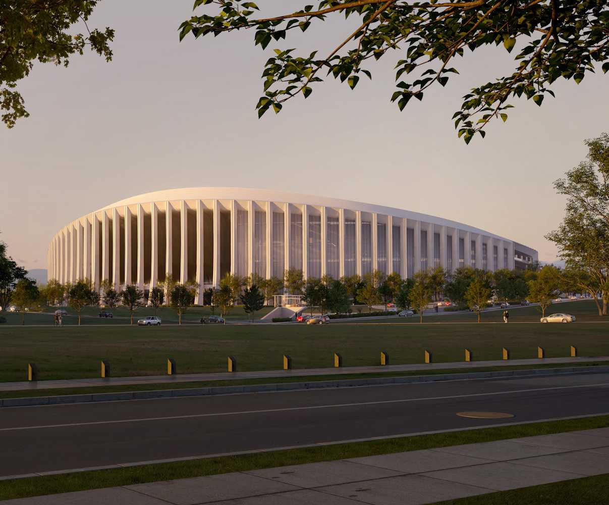 Budynek będzie wyższy po stronie północnej i południowej, tworząc łagodnie falujący kontur dachu, który zostanie wyprofilowany w kształt siodła. Na wschodzie i zachodzie powstaną duże, szklane wrota, podobne do tych, jakie znajdują się na stadionie Dallas Cowboys.