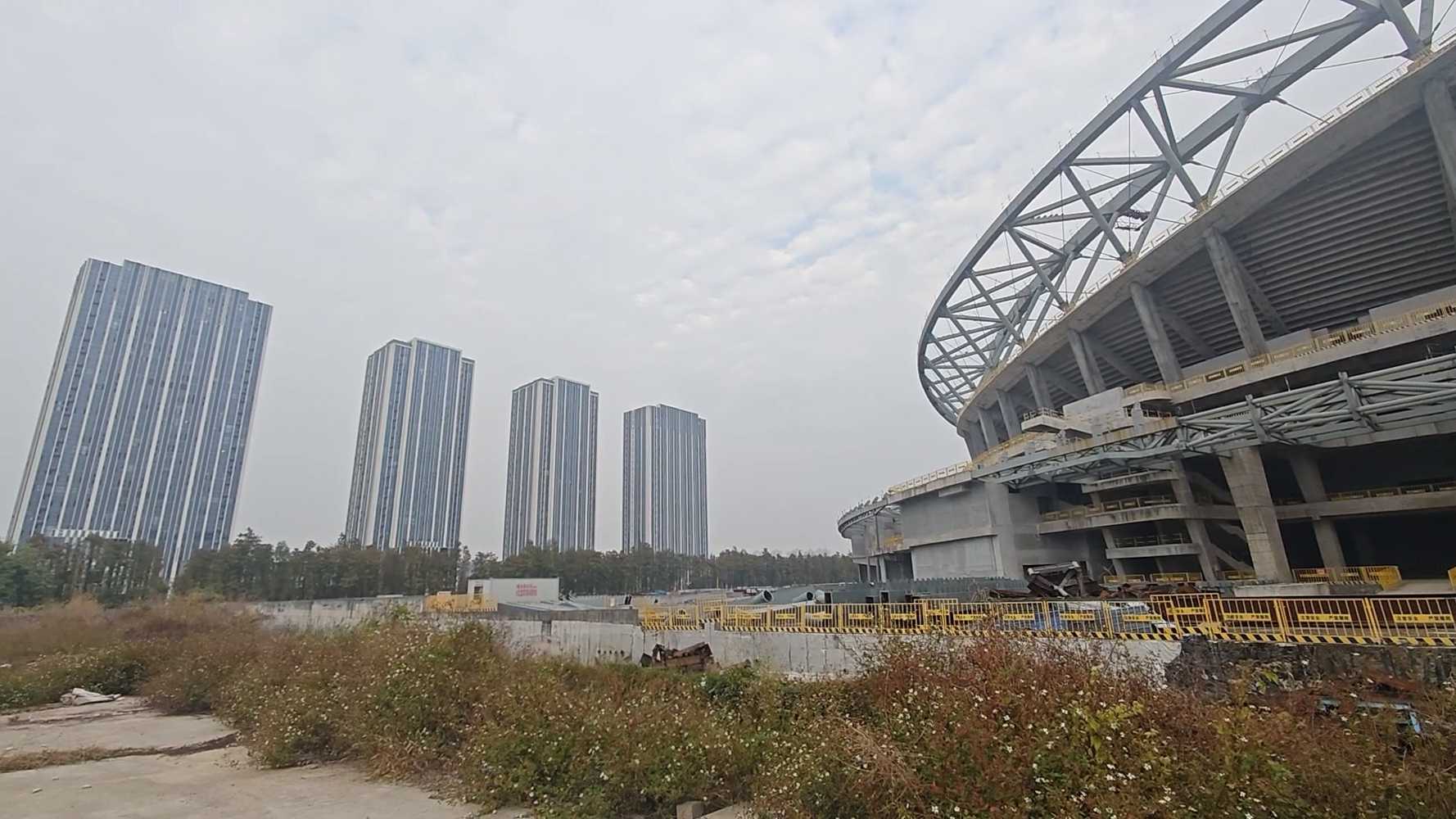 W trakcie budowy Evergrande Group popadło jednak w ogromne tarapaty finansowe i nie było w stanie dalej utrzymywać klubu, ani płacić za budowę stadionu. Od połowy 2021 prace przebiegały już w znacznie wolniejszym tempie. W połowie 2022 budowę całkowicie wstrzymano, a projekt przejęła spółka kontrolowana przez miasto.