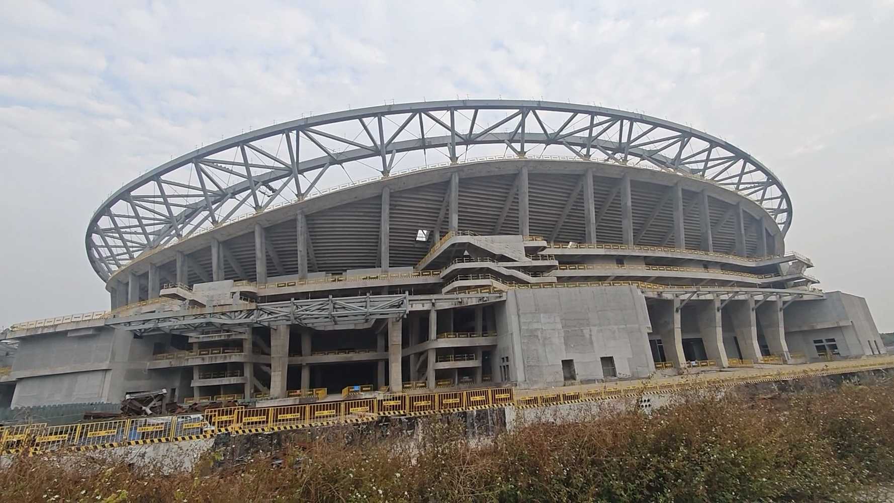 Budowa ruszyła w kwietniu 2020 i początkowo przebiegała bardzo sprawnie. Po wykonaniu fundamentów w 2020, w pierwszej połowie 2021 powstał dolny pierścień trybun.